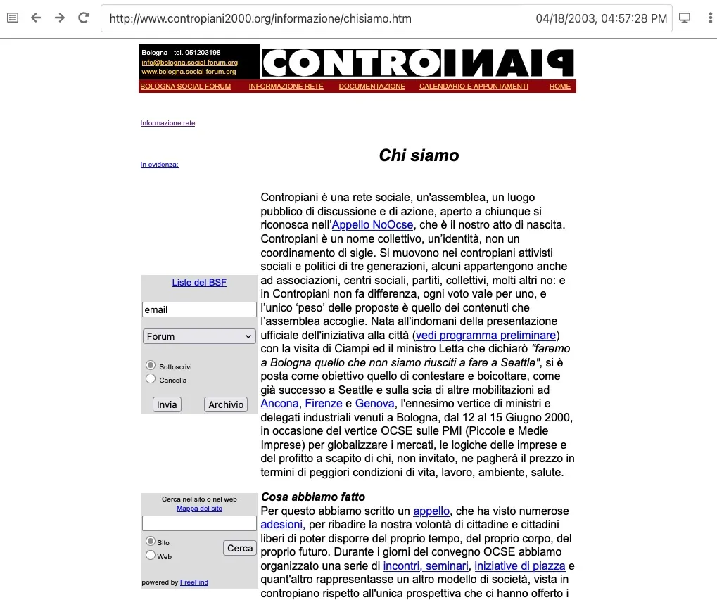 Il recupero del sito Contropiani2000, l’organo ufficiale di comunicazione del movimento bolognese nel periodo delle proteste noglobal, che avrebbero poi portato a Genova 2001. Il sito archiviato è qui https://archivio.network/web/contropiani2000