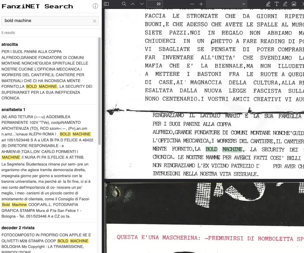 È il colossale progetto di raccolta di Fanzine di Paolo Palmacci: una collezione unica, l’abbiamo capito subito. Abbiamo curato per Paolo l’estrazione del testo (OCR) dai pdf delle zine, e poi realizzato questo motore di ricerca https://paolopalmacci.it/capitmundi/search/. Data la natura non uniforme di queste pubblicazioni - sia per l’impaginazione che per la qualità delle immagini - il testo estratto può presentare imprecisioni o risultare parzialmente inaffidabile.