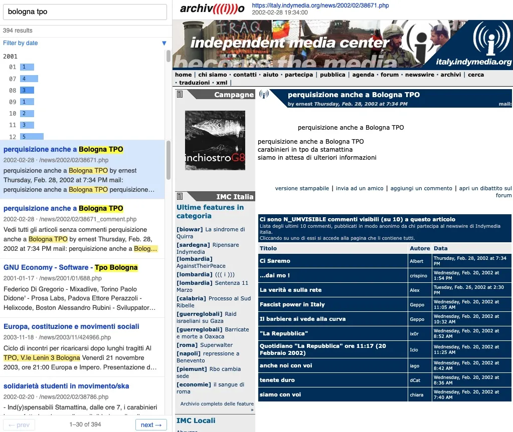 Questo è un lavoro in corso: un motore di ricerca per circa 300.000 post della copia di archivio di Indymedia Italia, mantenuta da Autistici.org. Sarà terminato prima dell’estate.