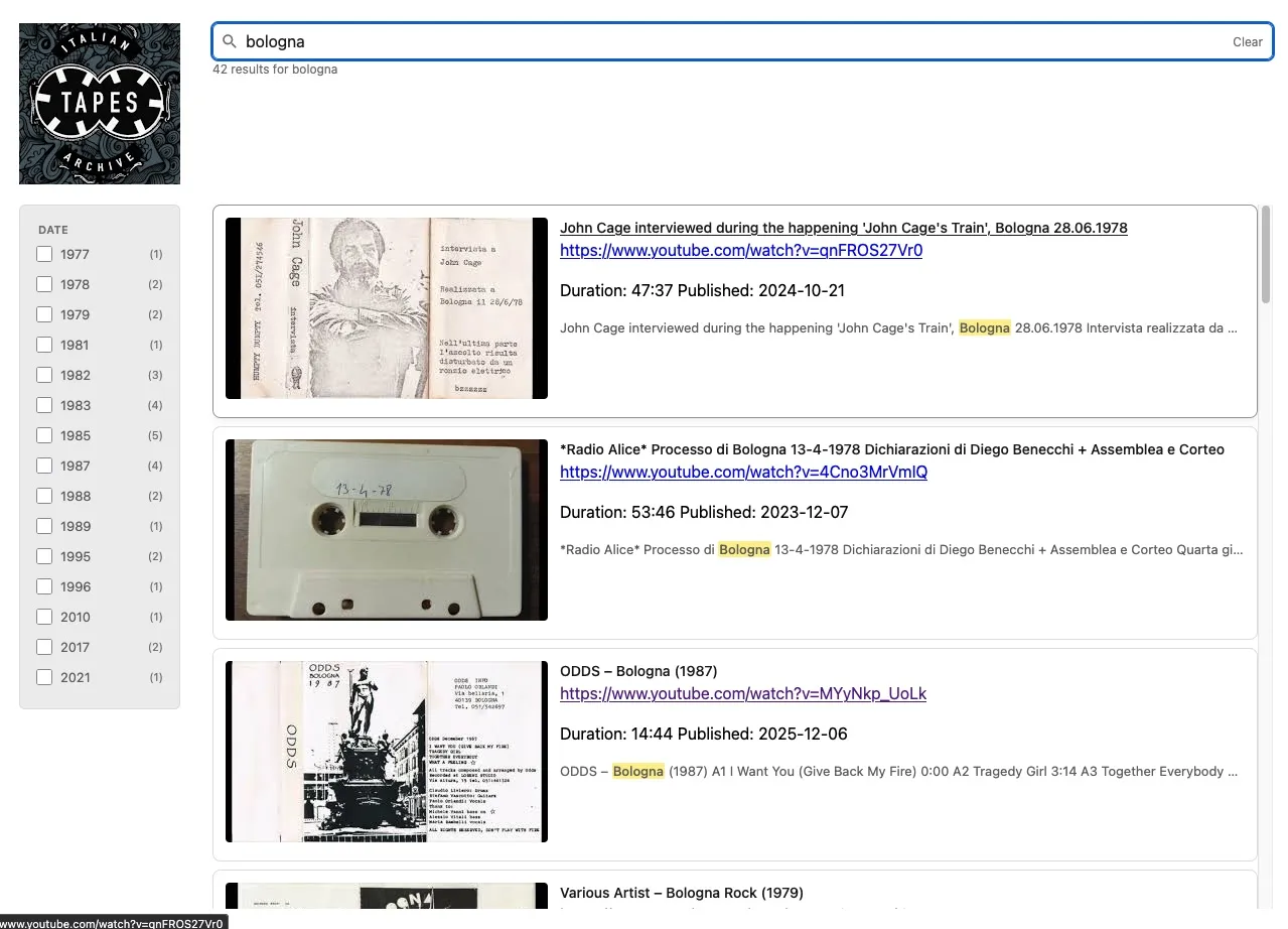 Italian Tapes Archive è uno degli archivi a cui siamo più affezionati, soprattutto per generi musicali oscuri (noise, power electronics). È un progetto di recupero e pubblicazione di audiocassette, sul canale Youtube (e in copia su Internet Archive) ci sono più di 2200 nastri, che spaziano dalla musica alle assemblee politiche di movimento. Per facilitarci nell’esplorazione del catalogo avevamo già realizzato questa pagina https://grafton9.net/italian-tapes-archive/, adesso ne abbiamo fatto una ulteriore https://archivio.network/italian-tapes-archive/, con un software diverso, Pagefind. Vi si può cercare nell’intero testo della descrizione e filtrare per data.