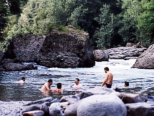 At the STOP sign, keep left, following indications to "fiume","Porto d'Adda". Once in Porto d'Adda, take the "No exit" street at the right of the church (touristic sign-post: "S. Maria della Rocchetta"). Park in front of the little cemetery and take the foot path marked PARCO ADDA NORD. Follow the foot-path in the woods until you reach the paved road where starts the staircase to Sanctuary. At this point turn LEFT, and follow the naviglio (canal): after an semi-destructed house on the right,continue walking for about five minutes until you'll find a signpost warning about sudden floads. Here take the narrow footpath on your right that will take you down to the river.