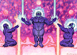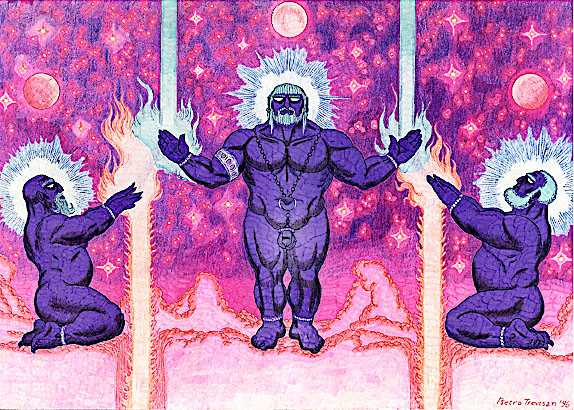 Ben presto però, dopo pochi giorni , Arktron aveva potuto scoprire che i kernan adoravano una Dea Celeste, che consideravano la loro antenata e la Creatrice del mondo, e che identificavano con la costellazione dell'Orsa Maggiore. La Dea si chiamava Aìs Rhaite, che voleva dire "Sacra Orsa" e infatti aveva l'aspetto dì un'Orsa nera con il manto trapunto di stelle bianche. Per questo, i Kernan credevano che gli orsi fossero i Suoi messaggeri. il Re era elettivo, e portava infatti il titolo di Cacciatore d'Orsi, il titolo più alto che poteva essere dato ad un uomo fra i Kernan. Più che dal desiderio di conquista, i Kernan erano stati spinti al Sud da una serie d'inverni particolarmente freddi, e credevano che fosse la loro Dea Orsa a guidarli. Arktron mandò un messaggio radio al Re di Gomur, con un dettagliato rapporto su ciò che aveva imparato sui Kernan. il Re lesse il rapporto e progettò subito un piano per Arktron. La notte seguente, i pallidi guerrieri del Nord impallidirono ancora di più alla terrificante visione che si profilò alla luce dei fuochi, al limitare degli accampamenti o sotto la luce della luna, nelle radure dei boschi di cedro. Due brillanti occhi di fuoco azzurro e argenteo li osservavano in continuazione dal buio, mentre una misteriosa figura, dai colori del tramonto, correva tra gli alberi, ruggendo paurosamente Qualche coraggioso aveva osato inseguirla per un tratto. ma il misterioso essere, che sembrava essere un orso. correva più veloce di un cavallo nonostante la sua enorme massa, maggiore dì quella di qualsiasi grande orso del Nord.