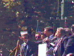 Gianfranco Fini, presidente di Allenaza Nazionale, saluta la folla.