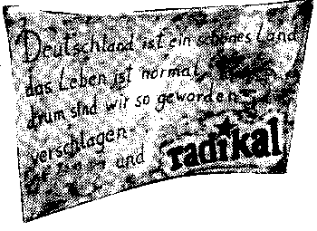 "Wer macht eigentlich die Radikal?Diejenigen, die Berichte von ihrer letzten Antitfa-Aktion schicken.Oder jene, die mal eben 10 Zeitungen von hier nach dort bringen und in ihrem Freundlnnen-Kreis verteilen, oder vielleicht der, der ein paar dieser Berichte abschreibt und lay-outet, oder die, die dafür sorgt, dass nur ein einziges Exemplar durch die Mauern des Knastes dringt?Vielleicht meint die BAW ja auch die, die wo chenlang diskutieren, um lange Artikel in der radikal zu veröf fentlichen.Oder jene, die tagelang hinter der Druckmaschine stehen?" (aus unserem Flugblatt zu den Durchsuchungen)